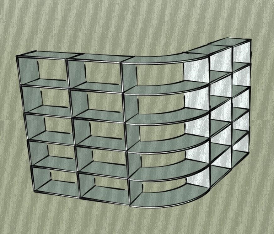 Zur Ver­wen­dung ei­nes Eck­re­ga­les als Raum­tei­ler bie­ten wir zu­sätz­lich ei­ne be­son­ders schö­ne Lö­sung an. Auch die Au­ßen­e­cke kann ge­run­det wer­den wo­durch ein form­schö­ner Über­gang der zwei Re­gal­sei­ten, so­wohl auf der In­nen­sei­te als auch auf der Au­ßen­sei­te, ent­steht. Auch hier ist je­der be­lie­bi­ge Win­kel mach­bar. Ih­rer Phan­ta­sie sind bei der Ge­stal­tung fast kei­ne Gren­zen ge­setzt. Kom­bi­nie­ren Sie links und rechts Kur­ven er­gibt sich ein mä­an­der­för­mi­ges Band. Ein Raum­tei­ler der ganz be­son­de­ren Art. Bit­te Schi­cken Sie uns Ih­re Wün­sche und Vor­stel­lun­gen - wir küm­mern uns um die Um­set­zung.