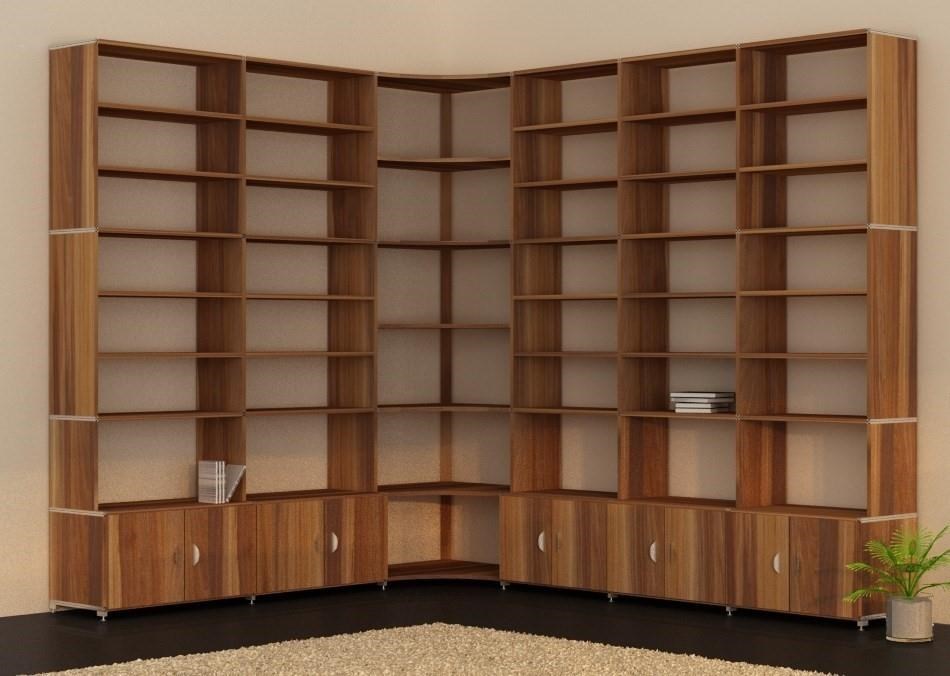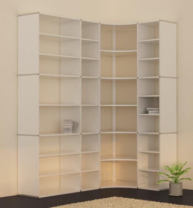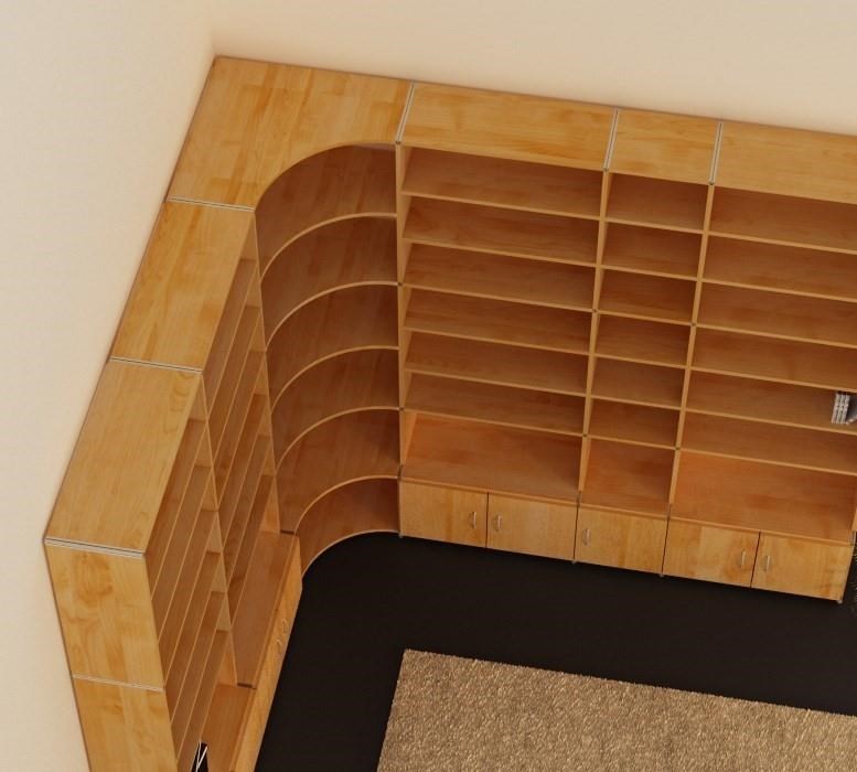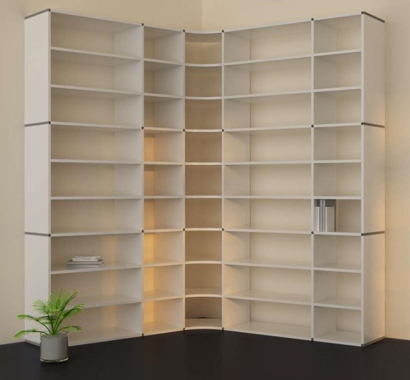 Wir bie­ten Ih­nen mit un­se­ren Eck­ele­men­ten ei­ne schö­ne, prak­ti­sche und durch­dach­te Lö­sung. Com­pu­ter­ge­steu­ert frä­sen wir an un­se­re Eck­bö­den ei­ne Run­dung. Da­mit steht Ih­nen bis in die Zim­me­r­e­cke hin­ein Re­gal­flä­che zur Ver­fü­gung. Und der raum­sei­ti­ge Bo­gen ver­bin­det die bei­den Re­gal­schen­kel schwung­voll mit­ein­an­der. Ei­ne wun­der­ba­re Lö­sung die ih­res­glei­chen sucht.
